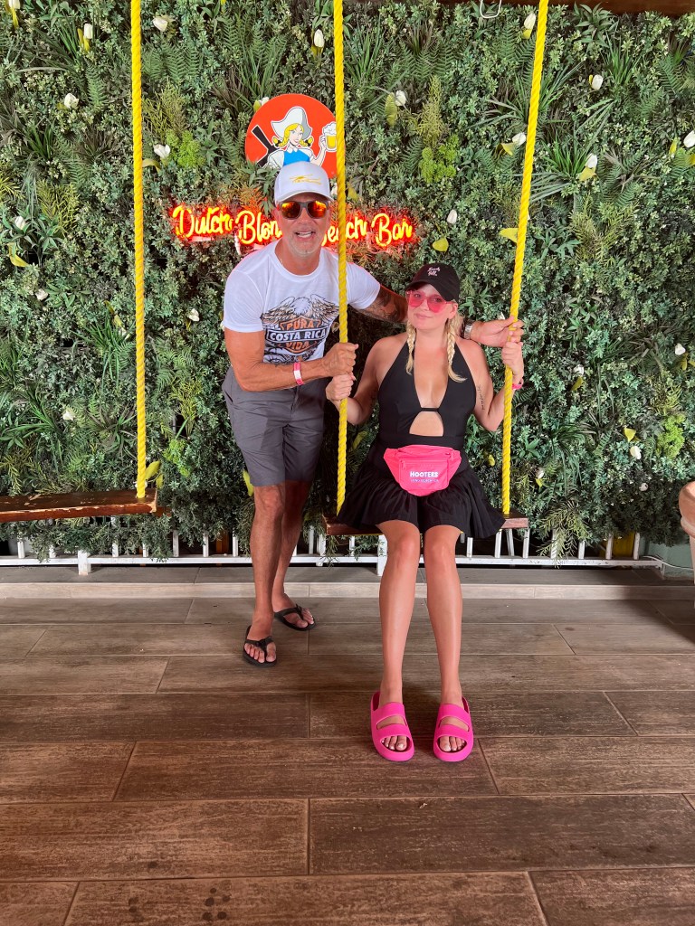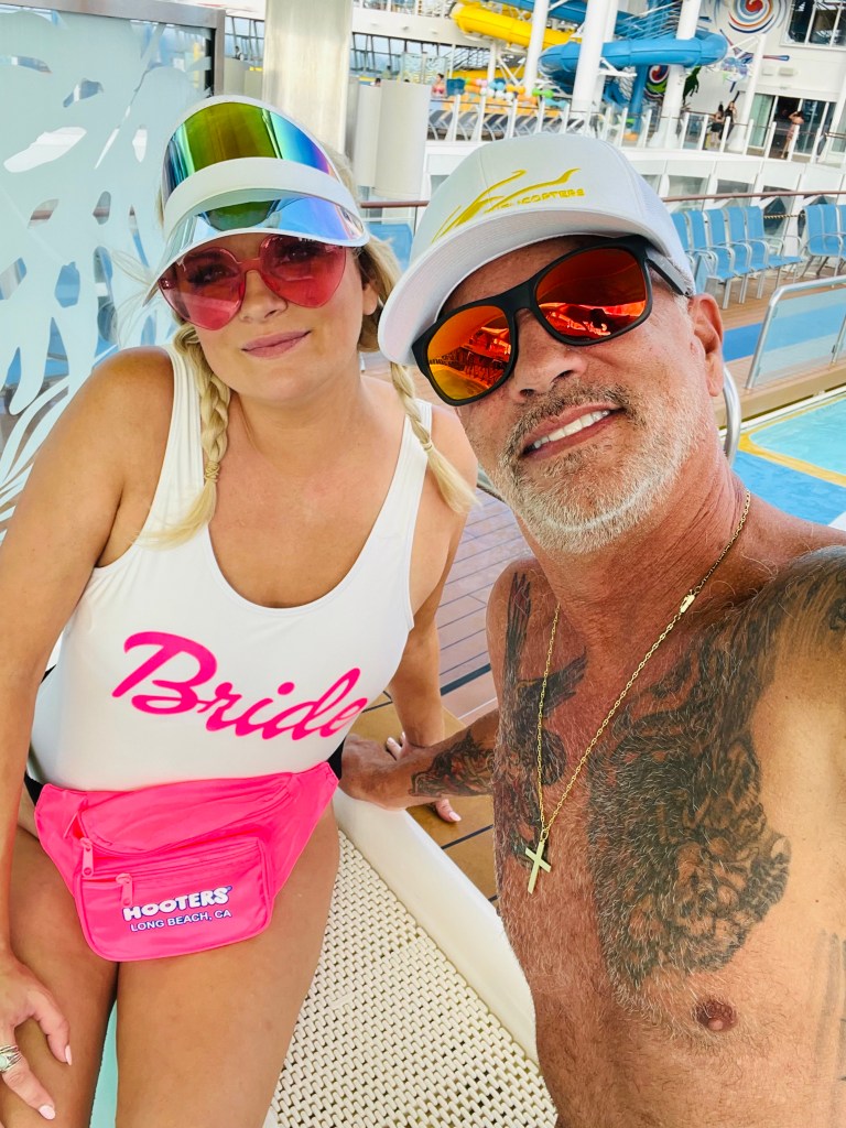 I wore my Bride swimsuit and my Hooters fanny pack. Back story on that…when Kaley had passed I was not doing well, I wasn’t eating, I wasn’t sleeping, I was crying all day so Lorenzo took me on a weekend trip to Catalina (that’ll be another blog post another time) and when we landed in Long Beach we passed a Hooters on our way home. Kaley used to work there in college and it was her favorite job. We stopped in, toasted in her honor and I saw a hot pink (K and I’s favorite color) fanny pack and knew I needed it for our honeymoon.